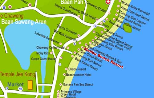 มาลิบู บีช รีสอร์ท ตั้งอยู่ในทำเลที่เหมาะสมบนหาดเฉวง หาดทรายขาวสะอาดที่เลื่องชื่อของเกาะสมุย ห่างจากสถานบันเทิงยามราตรีที่มีสีสันเพียงไม่กี่ก้าวเท่านั้น ห้องพักทุกห้องได้รับการตกแต่งด้วยรายละเอียดต่างๆที่ทันสมัยพร้อมอนุรักษ์ สไตล์ของความเป็นไทยมากที่สุด ท่านจะมีตัวเลือกมากมาย ทั้งการพักผ่อนในจากุซซี่ส่วนตัว หรืออาบแดดริมชายหาดก็ทำได้ นอกจากนี้ ยังสามารถช้อปปิ้งซื้อของได้ที่หน้าที่พักอีกด้วย ยามค่ำคืน ท่านสามารถออกไปสนุกสนานในบาร์ที่มีให้เลือกหลายรูปอีกด้วย โรงแรมให้บริการห้อง double และห้อง twin สำหรับคู่สามีภรรยาหรือมิตรสหาย และห้องขนาดใหญ่กว่าสำหรับครอบครัว