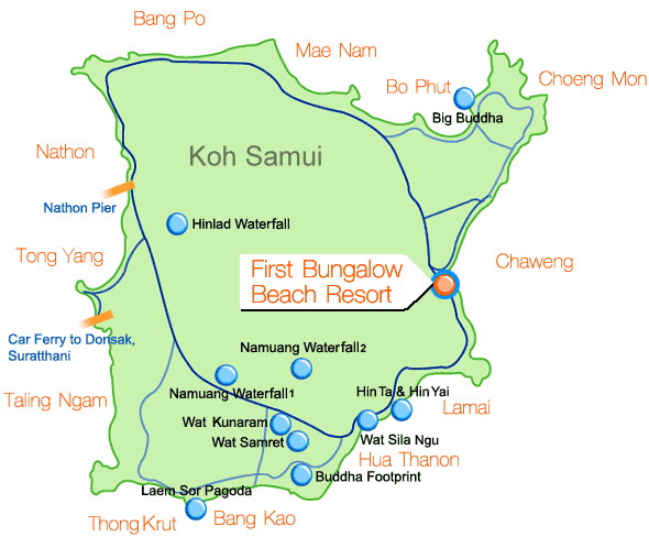 Resort First Bungalow ตั้งอยู่ห่างจากร้านค้าและสถานบันเทิงยามค่ำคืนที่หาดเฉวง เพียง 5 นาทีหากเดินทางโดยรถยนต์ และท่านสามารถเดินทางโดยรถยนต์จากที่พักไปยังสนามบินเกาะสมุยได้ใน 30 นาที และสามารถเดินทางโดยรถยนต์ 50 นาทีไปยังท่าเรือเฟอร์รี่สมุย