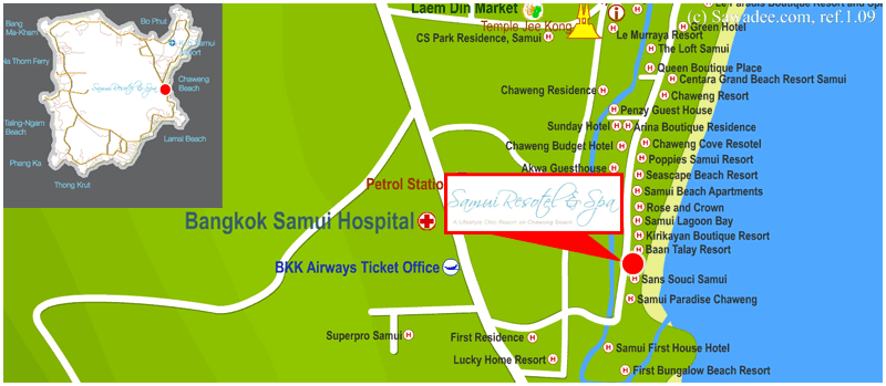 Samui Resotel and Spa ที่สวยงามตั้งอยู่บนหาดเฉวงที่ขาวสะอาด ที่พักแห่งนี้ให้บริการห้องพักที่ตกแต่งอย่างงดงาม ซึ่งมีทัศนียภาพทะเลสีครามและสวนหย่อมที่มีธรรมชาติเขตร้อน จากรีสอร์ทแห่งนี้ ท่านสามารถเดินทางโดยรถยนต์ไปยังสนามบินสมุยได้โดยใช้เวลา 15 นาที