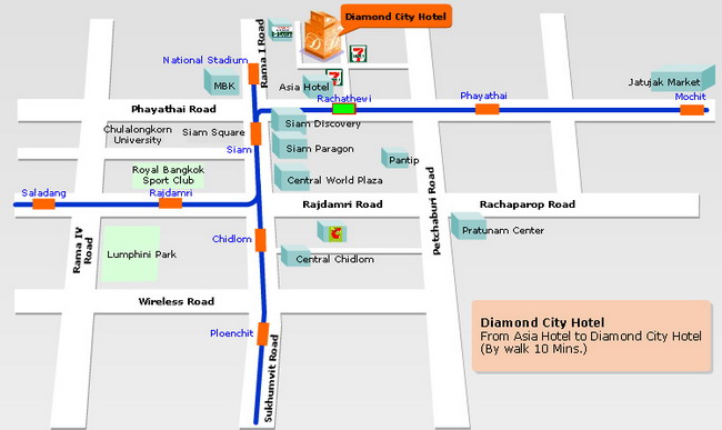 โรงแรมไดมอนด์ ซิตี้ ตั้งอยู่บนถนนพญาไท ในทำเลใจกลางกรุงเทพมหานคร ใกล้สถานีรถไฟฟ้าราชเทวี ระยะทางเดินเท้าจากโรงแรมเพียง 10 นาที เดินทางสะดวกสบายสู่แหล่งช้อปปิ้งชื่อดัง อาทิ สยามสแควร์, ศูนย์การค้า เอ็มบีเค เซ็นเตอร์, เซ็นทรัลเวิลด์, สยามพาราก้อน, พันธุ์ทิพย์พลาซ่า และด้วยการเดินทางเชื่อมต่อด้วยสถานีรถไฟฟ้า BTS เพียง 2 สถานี : ราชเทวี - พญาไท , กับ Airport Link จึงใช้เวลาเดินทางสู่ท่าอากาศยานแห่งชาติสุวรรณภูมิเพียง 30 นาที ภายในโรงแรมตกแต่งเรียบง่าย สไตล์คลาสสิค พร้อมสิ่งอำนวยความสะดวก อาทิ คอฟฟี่ชอป, ร้านอาหาร, บริการซักรีด, อินเตอร์เน็ต, ที่จอดรถ ไว้คอยบริการแด่ทุกท่าน