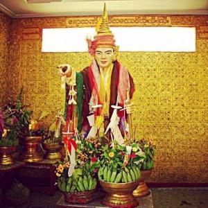 นำท่านขอพร นัตโบโบยีหรือเทพทันใจ เทพเจ้าศักดิ์สิทธิ์ของชาวพม่าและชาวไทยวิธีการสักการะรูปปั้นเทพทันใจ (นัตโบโบยี) เพื่อขอสิ่งใดแล้วสมตามความปราถนาก็ ให้เอาดอกไม้ ผลไม้ โดยเฉพาะมะพร้าวอ่อน กล้วยหรือผลไม้อื่นๆมาสักการะ นัตโบโบยี จะชอบมาก จากนั้นก็ให้เอาเงินจะเป็นดอลล่า บาทหรือจ๊าด ก็ได้(แต่แนะนำให้เอาเงินบาทดีกว่าเพราะเราเป็นคนไทย)แล้วเอาไปใส่มือของนัตโบโบยีสัก 2 ใบไหว้ขอพรแล้วดึกกลับมา 1ใบ เอามาเก็บรักษาไว้จากนั้นก็เอาหน้าผากไปแตะกับนิ้วชี้ของนัตโบโบยีแค่นี้ท่านก็จะสมตามความปรารถนาที่ขอไว้จากนั้นนำท่านข้ามฝั่งไปอีกฟากหนึ่งของถนน เพื่อสักการะ เทพกระซิบซึ่งมีนามว่า“อะมาดอว์เมี๊ยะ”ตามตำนานกล่าวว่า นางเป็นธิดาของพญานาค ที่เกิดศรัทธาในพุทธศาสนาอย่างแรงกล้ารักษาศีล ไม่ยอมกินเนื้อสัตว์จนเมื่อสิ้นชีวิต ไปกลายเป็นนัตซึ่งชาวพม่าเคารพกราบไหว้กันมานานแล้วซึ่งการขอพรเทพกระซิบต้องไปกระซิบเบาๆ ห้ามคนอื่นได้ยิน ชาวพม่านิยมขอพรจากเทพองค์นี้กันมากเช่นกันการบูชาเทพกระซิบ บูชาด้วยน้ำนม ข้าวตอก ดอกไม้ และผลไม้สมควรเวลาเดินสู่ สนามบินานาชาติมิงกาลาดง
