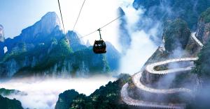นำท่านนั่งกระเช้าสู่ เขาเทียนเหมินซาน กระเช้าแห่งนี้จัดว่าเป็นกระเช้าที่มีความยาวที่สุดในโลก ระยะทางประมาณ 7.5 กิโลเมตร โดยใช้เวลานั่งประมาณ 40 นาที 1 กระเช้านั่งได้ประมาณ 8 ท่าน และกระเช้าแห่งนี้จัดได้ว่าเป็นกระเช้าที่มีความทันสมัยมากที่สุดแห่งหนึ่ง ระหว่างทางท่านจะได้ชมความงามของภูเขานับร้อยลูก สลับซับซ้อนกันดูสวยงามแปลกตา