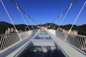 นำท่านท้าทายความสูงสุดหวาดเสียวกับ ทางเดินกระจก ซึ่งมีระยะทางอยู่ที่ 60 เมตร ล้อมรอบไปด้วยหน้าผาสูงชัน ความกว้างของทางเดินกระจกวัดจากขอบหน้าผาได้ประมาณ 3 ฟุต มีความหนา 2.5 นิ้ว ถือเป็นการท้าทายนักท่องเที่ยวที่อยากมาสัมผัสทิวทัศน์อันงดงามบนเขาเทียนเหมินซาน โดยทางอุทยานมีกฏให้นักท่องเที่ยวต้องสวมรองเท้ากันลื่น ซึ่งมีคุณสมบัติช่วยเช็ดฝุ่นบนพื้นผิวกระจกไปด้วยในเวลาเดียวกัน