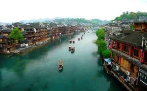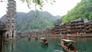 บริการอาหารกลางวัน ณ ภัตตาคาร นำท่าน ล่องเรือตามลำน้ำถัวเจียง การล่องเรือชมบรรยากาศของสองฝั่งแม่น้ำถั่วเจียง ถือว่าเป็นไฮไลท์ในการเที่ยวชมภายในเมืองโบราณเฟิ่งหวง ชมบ้านเรือนสองฟากฝั่งแม่น้ำ สะพานโบราณ เจดีย์วั่นหมิง หอตั๋วชุ่ย ฯลฯ ซึ่งเต็มไปด้วยบ้านเรือนที่มีลักษณะการก่อสร้างแบบจีนโบราณสร้างในสมัยราชวงศ์หมิงและชิง ระหว่างทางจะมีชาวบ้านซึ่งเป็นชนเผ่าดั้งเดิมของที่นี่เรียกว่าชนเผ่าถู่เจียง เอาเรือออกมาลอยลำคอยร้องเพลงต้อนรับนักท่องเที่ยวและไกด์ก็จะเชิญ ชวนให้นักท่องเที่ยวร้องเพลงตอบกลับไป ซึ่งไม่ว่าเราจะร้องเป็นเพลงไทยหรือจีนออกมาเค้าก็จะร้องเพลงตอบกลับมาเพิ่มสีสันระหว่างการล่องเรือให้สนุกสนาน (หากไม่สามารถล่องเรือได้ จะเปลี่ยนโปรแกรมเป็น นำท่านชมบ้านตระกูลหยาง และชมพิพิธภัณฑ์เมืองโบราณเฟิ่งหวงแทน)
