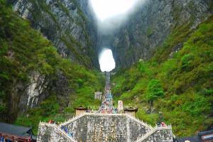 นำท่านท้าทายความสูงสุดหวาดเสียวกับ ระเบียงแก้ว ซึ่งเป็นสะพานกระจก ซึ่งมีระยะทางอยู่ที่ 60 เมตร ล้อมรอบไปด้วยหน้าผาสูงชัน ความกว้างของระเบียงแก้ววัดจากขอบหน้าผาได้ประมาณ 3 ฟุต มีความหนา 2.5 นิ้ว ถือเป็นการท้าทายนักท่องเที่ยวที่อยากมาสัมผัสทิวทัศน์อันงดงามบนเขาเทียนเหมินซาน ซึ่งทุกท่านจะต้องสวมผ้าหุ้มรองเท้าขณะเดินบนระเบียงแก้ว เพื่อรักษาความสะอาดและความใสของกระจก จากนั้นนำท่านเดินทางผ่านเส้นทางที่ 99 โค้งสู่ถ้ำเทียนเหมินต้ง หรือเรียกว่า ถ้ำประตูสวรรค์ ประวัติของโพรงถ้ำแห่งนี้เริ่มบันทึกไว้ว่า ราวปี ค.ศ. 263 จู่ๆหน้าผาของ ภูเขาซ่งเหลียง(Songliang Shan) ที่สูงนับพันเมตรเกิดถล่มลงมา ก่อให้เกิดโพรงถ้ำขนาดมหึมาคล้ายช่องประตูยักษ์ ด้วยเหตุนี้ทำให้ภูเขาลูกนี้ถูกเรียกเป็น เทียนเหมิน หรือ ประตูสวรรค์ นับตั้งแต่นั้นมา ประตูนี้มีความสูง 131.5 เมตร ความกว้าง 57 เมตร ความลึก 60 เมตร เมื่อท่านมาถึงถ้ำประตูสวรรค์ท่านจะได้ขึ้นขั้นบันได 999 ขั้น สู่ภูเขาประตูสวรรค์ สมควรแก่เวลาเดินทางลงจากเขาด้วยรถอุทยาน จากนั้นนำท่านสู้ ร้านผลิตภัณฑ์ยางพารา ให้ท่านได้เลือกชมสินค้าและผลิตภัณฑ์เครื่องนอนเพื่อสุขภาพชนิดต่างๆ (**หมายเหตุ : อาจจะมีเปลี่ยนแปลงเป็นนั่งรถอุทยาน + ขึ้นบันไดเลื่อน + ลงกระเช้า เพื่อความสะดวกแก่ลูกค้าที่จะไม่ต้องรอคิวนาน หรือหากบันไดเลื่อนประกาศปิด การเที่ยวต้องเป็นขึ้น+ลงกระเช้า ทั้งนี้ทางบริษัทจะเปลี่ยนแปลงตามความเหมาะสมอย่างใดอย่างหนึ่ง //และในส่วนการนั่งรถของอุทยานขึ้นไปบนถ้ำประตูสวรรค์ หากรถของอุทยานไม่สามารถขึ้นไปที่ถ้ำประตูสวรรค์ได้ ทางบริษัทฯ จะไม่คืนเงิน และไม่จัดโปรแกรมอื่นมาทดแทนให้ ทั้งนี้ ขึ้นอยู่กับสภาวะอากาศ และการรักษาความปลอดภัยของนักท่องเที่ยว ขอสงวนสิทธิ์ยึดตามประกาศจากทางอุทยานเป็นสำคัญ โดยที่ไม่ต้องแจ้งให้ทราบล่วงหน้า**)