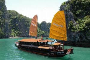 บริการอาหารกลางวันบนเรือ ณ ภัตตาคาร **เมนูพิเศษไวน์แดง DALAT**พร้อมทั้งชมทัศนียภาพของอ่าวฮาลอง
