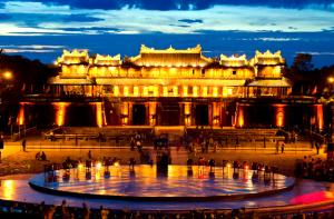 เดินทางเข้าสู่ เมืองเว้ เมืองที่มีความเจริญรุ่งเรืองในอดีต โบราณสถานอันงดงาม และทรงคุณค่าวัฒนธรรมที่มีแบบฉบับของตนเอง เว้ จึงได้รับการยืนยันจาก องค์ การยูเนสโกประกาศขึ้นทะเบียนให้เป็นมรดกโลกทางวัฒนธรรมในปี พ.ศ. 2536 ให้ เป็นมรดกโลกWORLD HERITAGE 1 ใน 3 แห่งที่มีอยู่ในประเทศเวียดนามใช้ เวลาเดินทางประมาณ 2 ชั่วโมง นำท่านเยี่ยมชมพระราชวังหลวงของกษัตริย์ราชวงศ์ เหวียนพระราชวังแห่งนี้สร้างขึ้นในปี พ.ศ. 2348ในสมัยยาลองเคยเป็นที่ประทับของ พระมหากษัตริย์ราชวงศ์เหวียน13 พระองค์ พระราชวังแห่งนี้ตั้งอยู่ใจกลางเมือง เป็น มรดกตกทอดอันยิ่งใหญ่และงดงามแห่งนี้ได้ถูกสร้างขึ้นตามแบบแผนความเชื่อของ จีนจากนั้นอิสระช้อปปิ้งที่ตลาด Dong Ba เป็นตลาดใหญ่ ตั้งอยู่ริมฝั่งแม่น้ำหอม รอบนอกจะเป็นสินค้าของที่ระลึกเป็นส่วนมาก ด้านในเป็นของใช้ ทั่วไป
